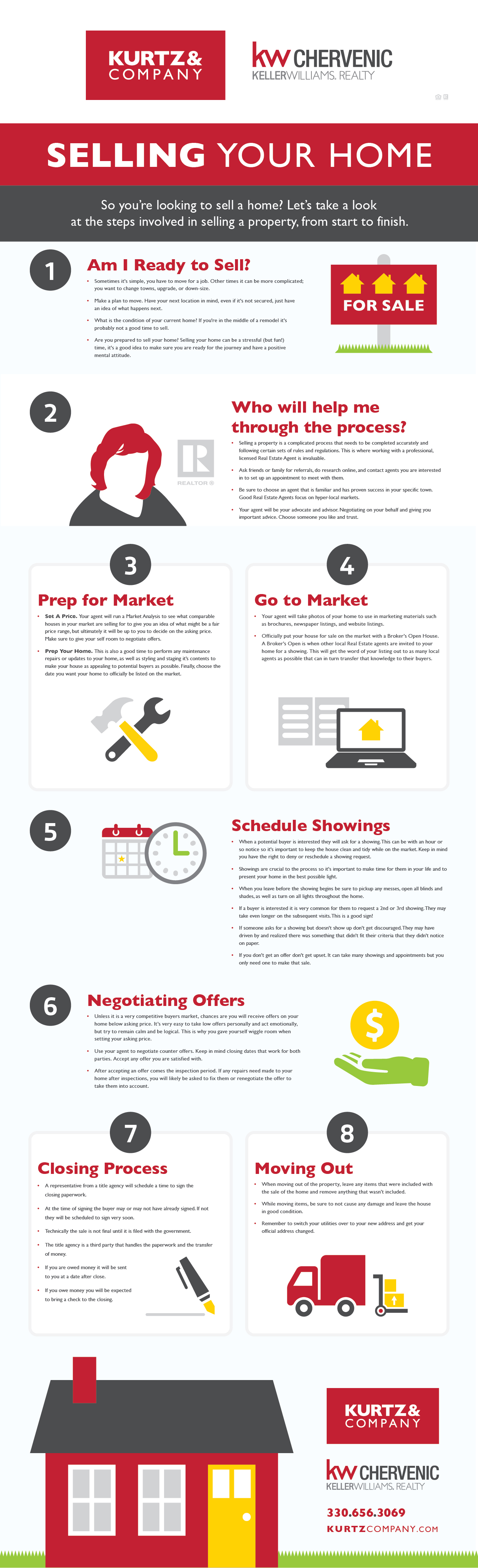 The infographic goes into more detail, but the home selling process generally consists of a series of steps that address some questions and concerns you might have. Some of these steps are: Am I ready to sell? Who will help me through the process? How will to prep my house for the market? You can view them all, in the pdf below.